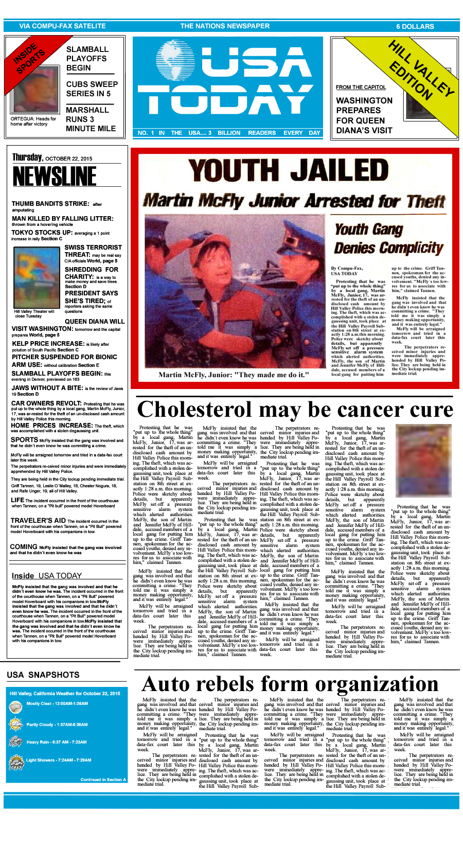 Reading from the USA Today, Marty discovers that his son was “tried, convicted, and sentenced to 15 years in the state penitentiary” all within two hours of his initial arrest. Doc explains: “The justice system works swiftly in the future now that they've abolished all lawyers!”